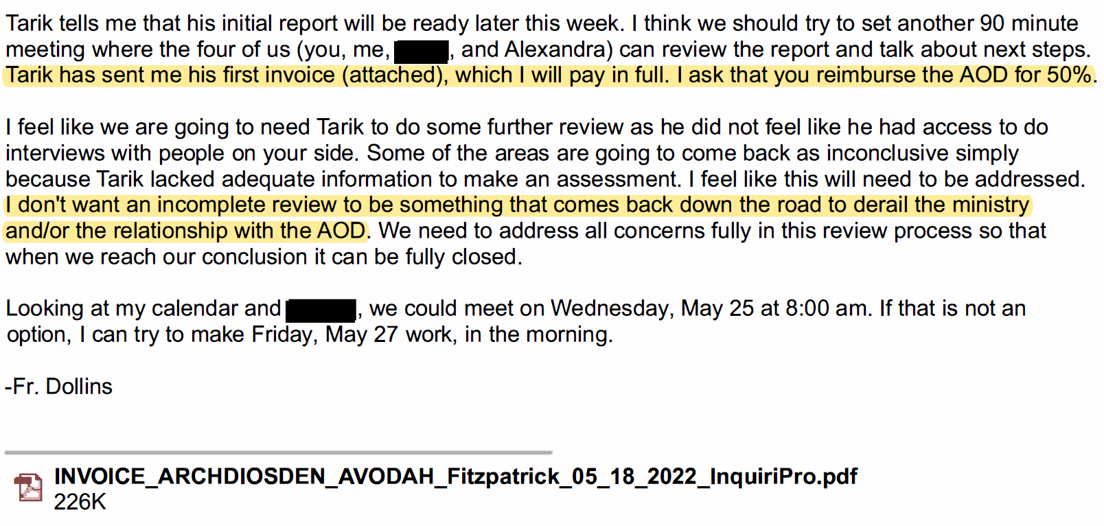 Excerpt from a May 17 email from Fr. Dollins in which Fr. Dollins requests payment for the initial invoice and indicates the review will continue.
